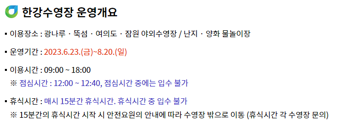 한강 수영장의 경우 장소에 관계없이 운영기간과 이용시간이 동일합니다. 2023년 운영기간은 6.23. 부터 8.20. 까지 이며, 이용시간은 09시 부터 18시 까지 입니다. 이용시간은 수영시간 45분 / 휴식시간 15분이며, 점심시간은 12시부터 12시40분까지 40분 간 입수 불가입니다.